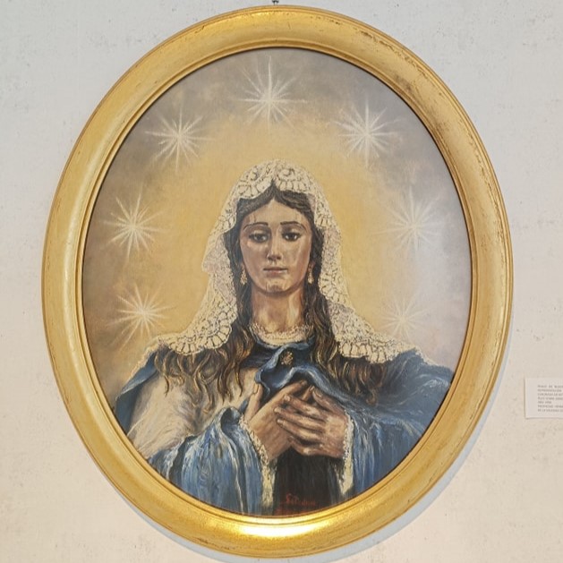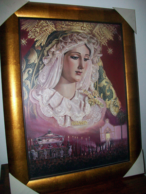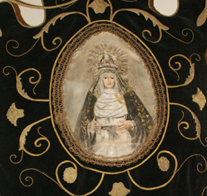 Se trata de una imagen sobre tela de Ntra. Sra. de la Soledad de Viernes Santo, con la corona de plata antigua.