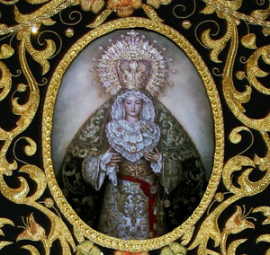 Representa a nuestra Bendita Madre, la Virgen de la Soledad, con mantilla blanca e idealizada como Inmaculada y ra rodea una aureola de estrellas.